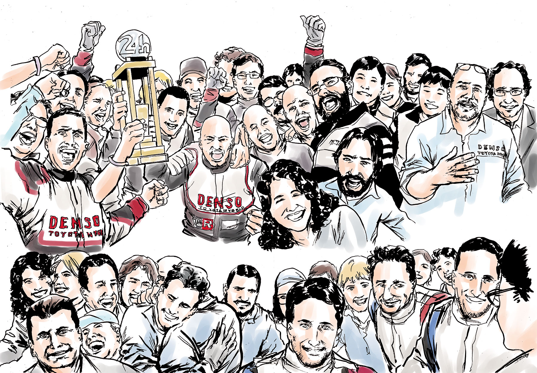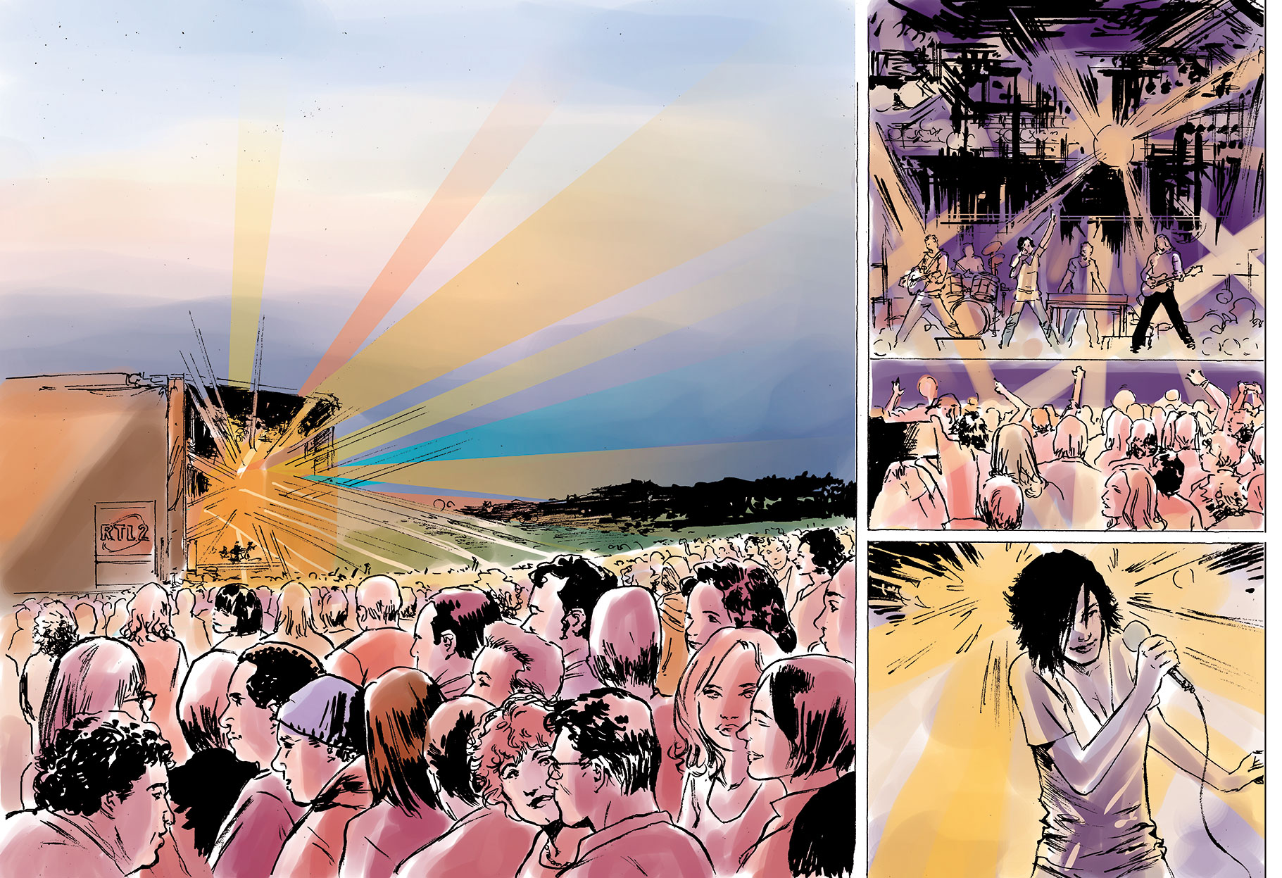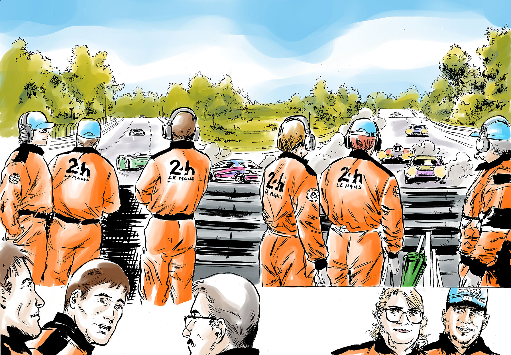 Digital watercolor coloring technique for the Elodie Font and Jean-Jacques Dzialowski Le Mans 24-hour chronology comic, for the Jungle Éditeur of France and Lemans Organization.