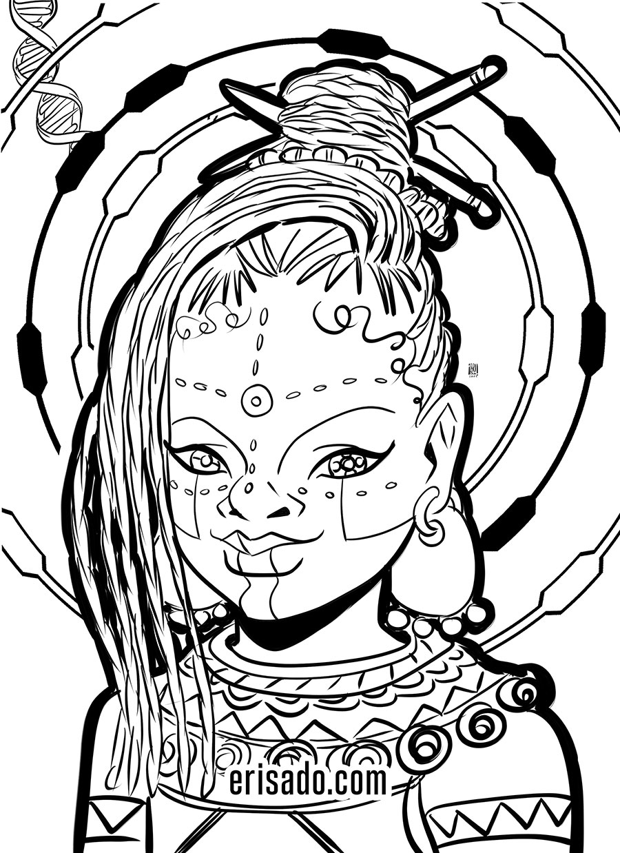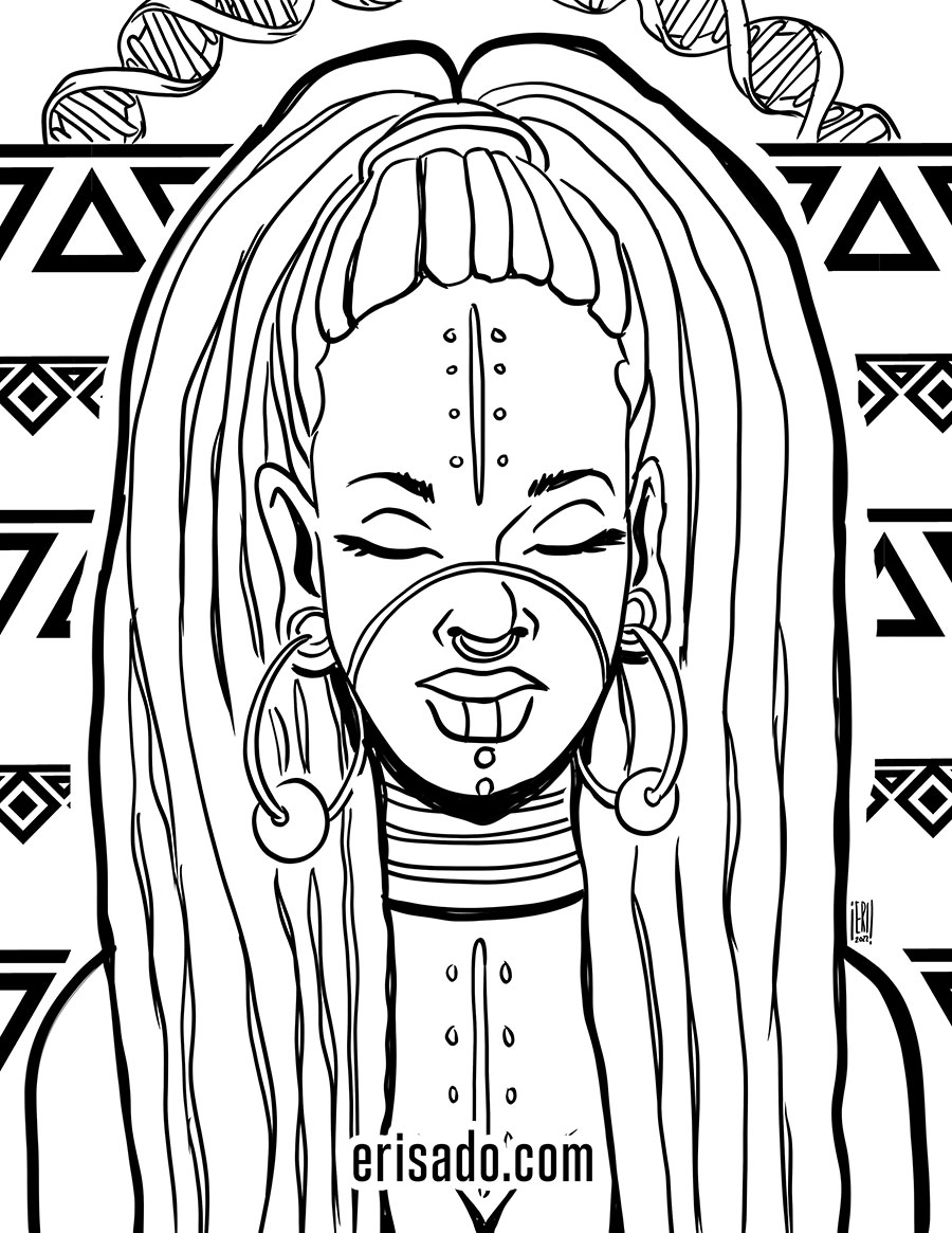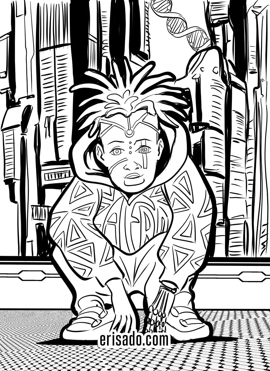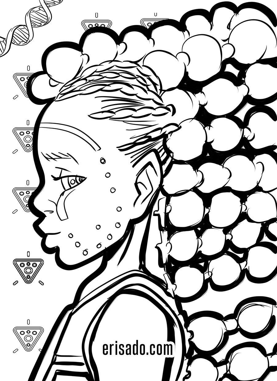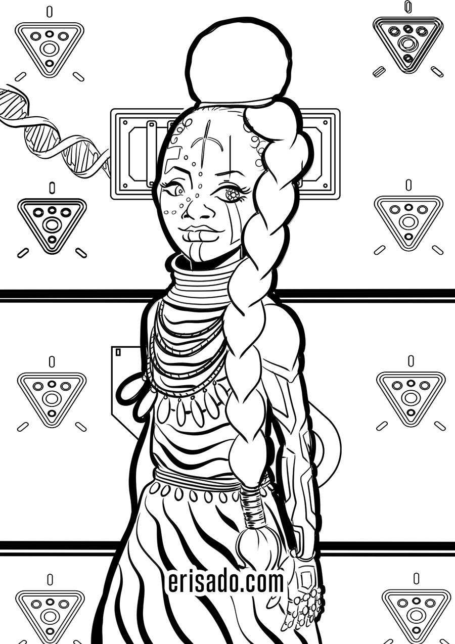 For the second part of the colouring book, Mario let me add my Afrofuturism style for the last 22 illustrations. I love how the work ended, and Mario loves it too!