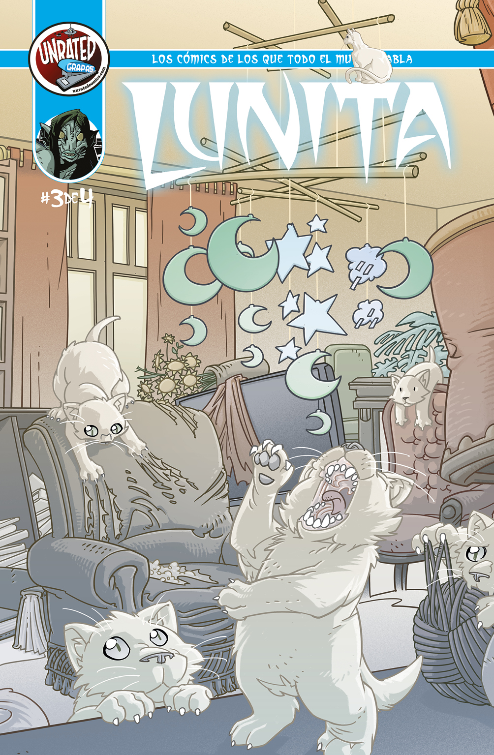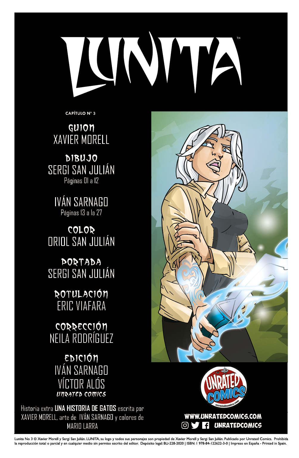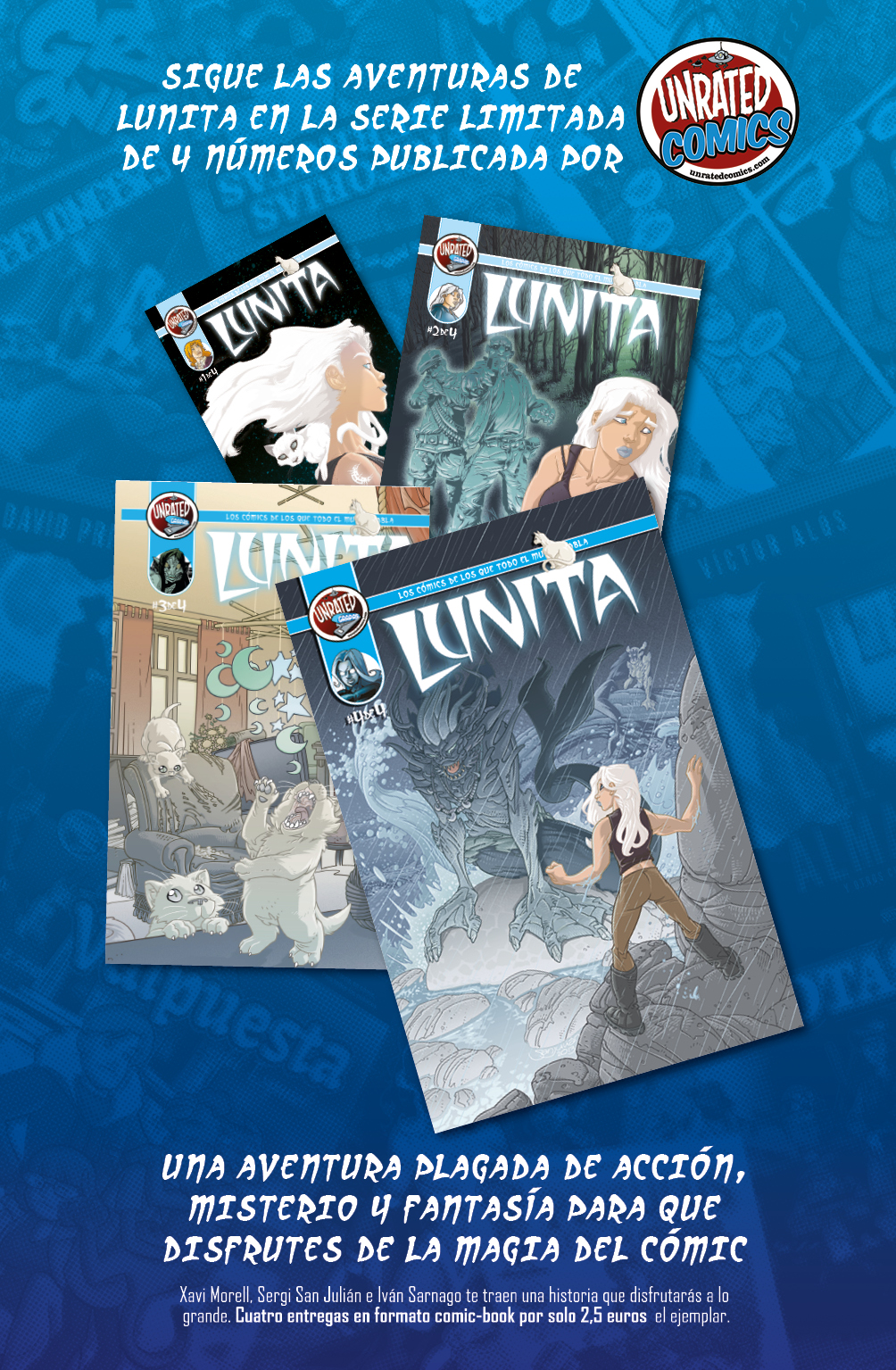Lettering for the Spanish version of Lunita #3 comic. Edited by Unrated comics. Script by Xavier Morell, art by Sergi San Julián and Iván Sarnago. Original English edition by Amigo comics.
