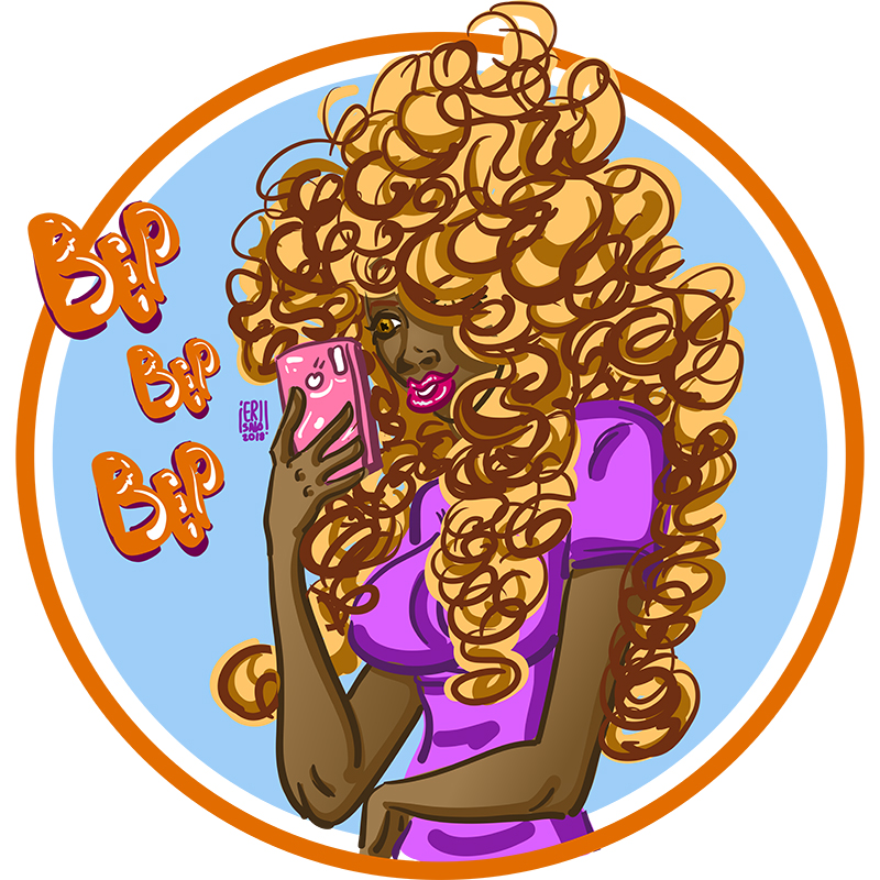 Illustration of a woman of the blackest skin and curly blonde hair with a color palette of blue, orange, pink, yellow and brown, pinker phone icon and cell phone tone BEP!