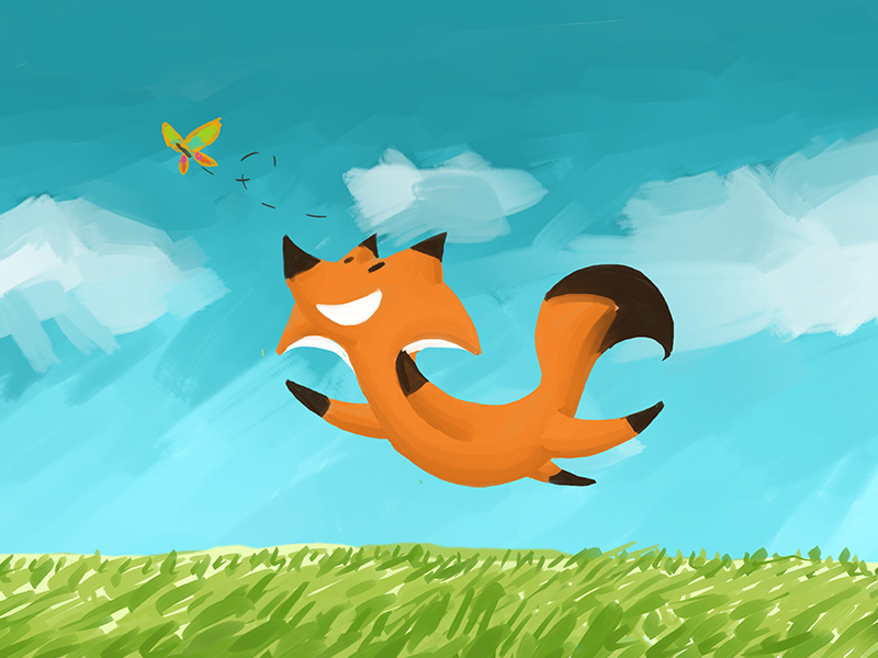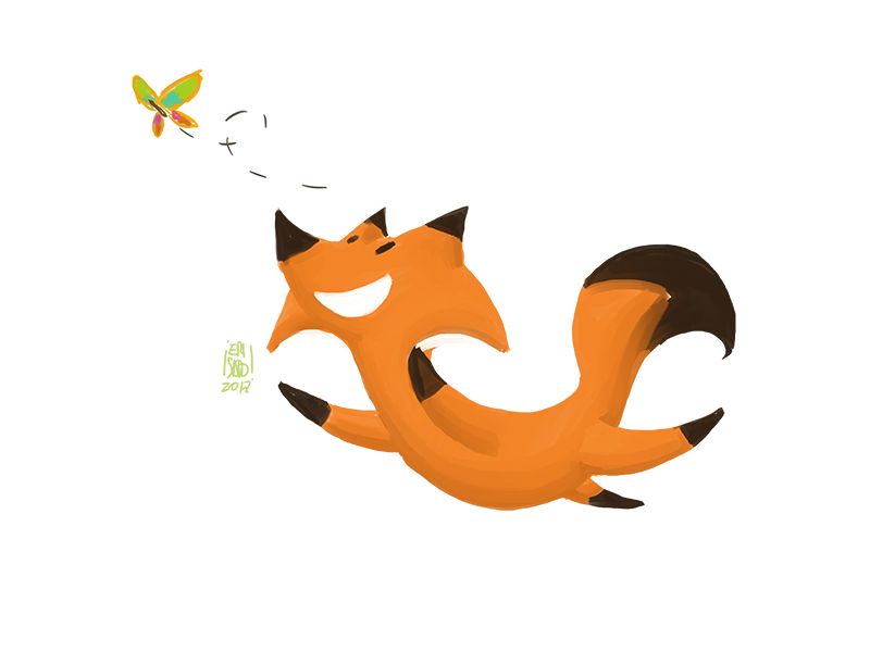 Fox and butterfly oil painting by Erisado, it is an illustration that is part of a study in character design that I am working on for a possible children’s story.