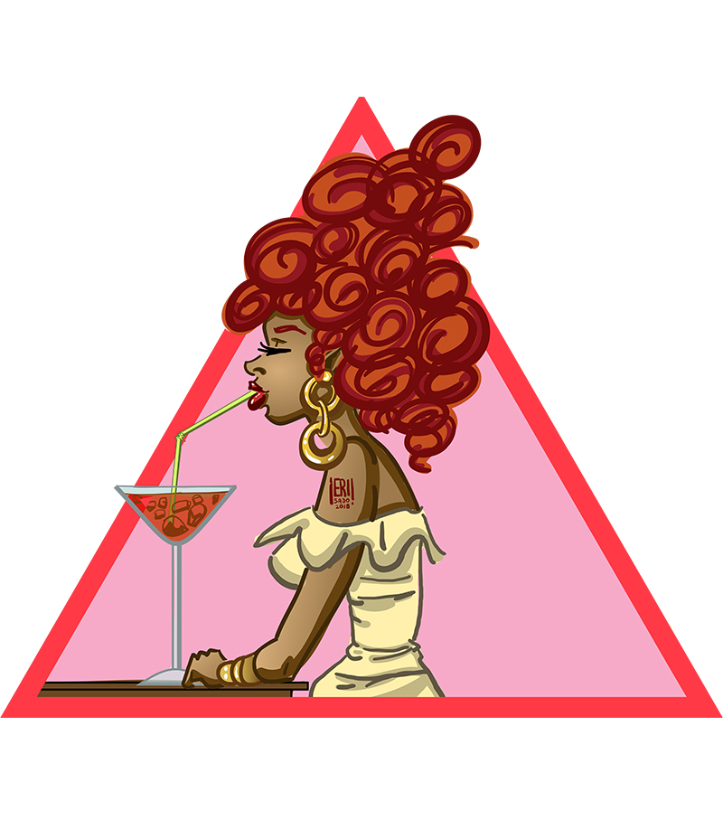 The beauty of the naturally curly hair of the Afro American girls. Illustration of a girl who shows her topknot natural hair red with pride and drinking a cocktail. They’re modern, empowered and sexy.